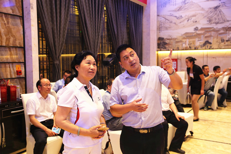 集团副总经理郑雪松为冯守瑞会长介绍水席园旗舰店大厅装潢