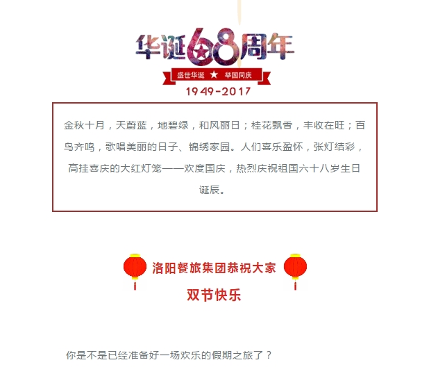 十月一千万别离开洛阳!这份洛阳游玩超级攻略省钱又省时! 发布时间:2017-10-01来源:点击:2464 以上信息来源于洛阳餐旅集团官网:www.allenresha.com 分享到:0 用手机看 拍下二维码,信息随身看 试试用微信扫一扫,在你手机上继续观看此页面。 上一篇:“餐旅杯”河南省餐饮饭店三项大赛洛阳选拔赛拉开序幕 下一篇:河南省收藏家协会洛阳办事处落户喜庆文化博物馆(筹)