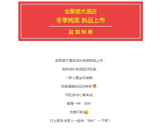 送温暖!宴天下老城店新品炖菜火热上市 让这个冬天不再寒冷 发布时间:2017-10-27来源:点击:2289 洛阳餐旅 宴会专家全国预订客服热线:400-616-3939微信号:hacyly股票代码:836977长按二维码识别后添加关注以上信息来源于洛阳餐旅集团官网:www.allenresha.com 分享到:0 用手机看 拍下二维码,信息随身看 试试用微信扫一扫,在你手机上继续观看此页面。 上一篇:河南省文物专家考察洛阳华夏喜庆文化博物馆(筹) 并对藏品进行鉴定 下一篇:送温暖!全聚德大酒店新品炖菜火热上市 让这个冬天不再寒冷