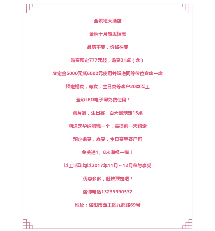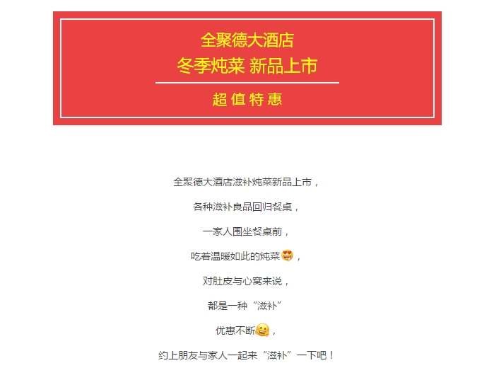 送温暖!全聚德大酒店新品炖菜火热上市 让这个冬天不再寒冷 发布时间:2017-10-28来源:点击:2329 洛阳餐旅 宴会专家全国预订客服热线:400-616-3939微信号:hacyly股票代码:836977长按二维码识别后添加关注以上信息来源于洛阳餐旅集团官网:www.allenresha.com 分享到:0 用手机看 拍下二维码,信息随身看 试试用微信扫一扫,在你手机上继续观看此页面。 上一篇:送温暖!宴天下老城店新品炖菜火热上市 让这个冬天不再寒冷 下一篇:洛阳餐旅集团旗下各店2017年11月-2018年2月可预订宴会日期一览表(10.30更新)