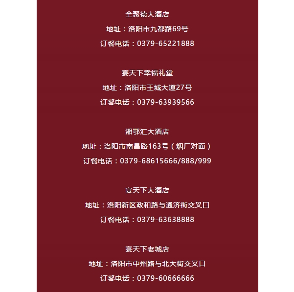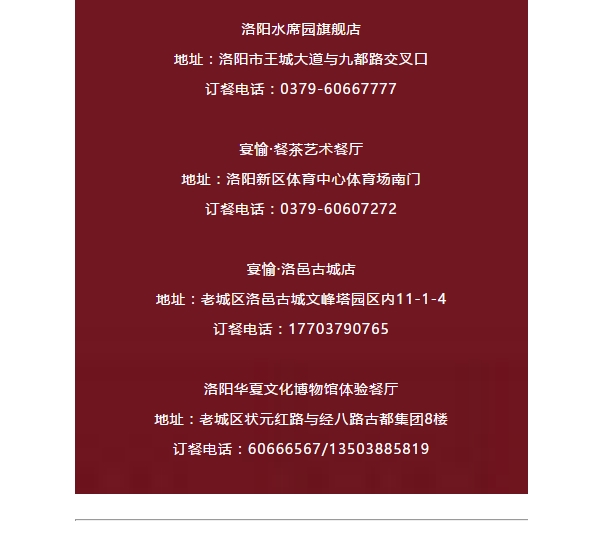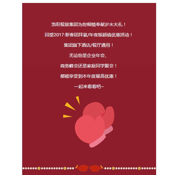 洛阳餐旅集团旗下酒店 团拜宴 | 年夜饭火热预定中······ 发布时间:2017-11-28来源:点击:2361 洛阳餐旅 宴会专家全国预订客服热线:400-616-3939微信号:hacyly股票代码:836977长按二维码识别后添加关注以上信息来源于洛阳餐旅集团官网:www.allenresha.com 分享到:0 用手机看 拍下二维码,信息随身看 试试用微信扫一扫,在你手机上继续观看此页面。 上一篇:宴愉一周岁了!感恩回馈生日趴 海鲜泡饭9.9元!超多优惠等您来! 下一篇:中国食品安全报编辑部主任张基廷等一行参观考察洛阳旅发集团旗下华夏喜庆文化博物馆