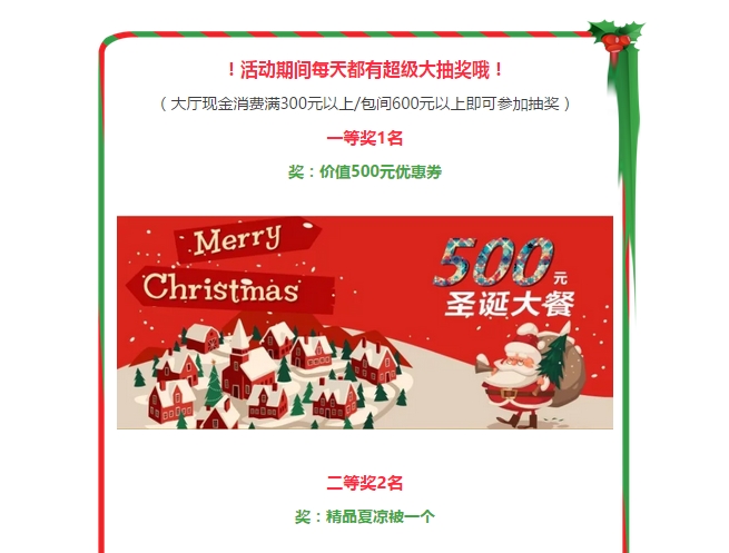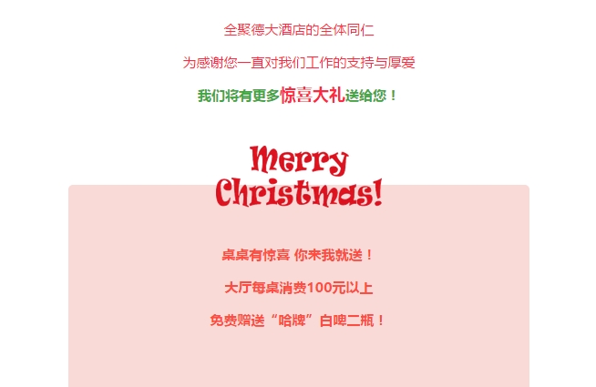 High翻平安夜 狂欢圣诞节丨尽在全聚德大酒店 发布时间:2017-12-14来源:点击:2446 洛阳餐旅 宴会专家全国预订客服热线:400-616-3939微信号:hacyly股票代码:836977长按二维码识别后添加关注以上信息来源于洛阳餐旅集团官网:www.allenresha.com 分享到:0 用手机看 拍下二维码,信息随身看 试试用微信扫一扫,在你手机上继续观看此页面。 上一篇:High翻平安夜 狂欢圣诞节丨尽在宴天下新区店 下一篇:洛阳餐旅第九届烹饪服务技能大赛隆重举行