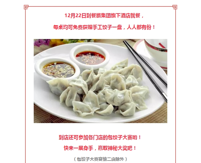 冬至 | 免费手工饺子!更有包饺子大赛赢神秘大奖! 发布时间:2017-12-21来源:点击:2622 洛阳餐旅 宴会专家全国预订客服热线:400-616-3939微信号:hacyly股票代码:836977长按二维码识别后添加关注以上信息来源于洛阳餐旅集团官网:www.allenresha.com 分享到:0 用手机看 拍下二维码,信息随身看 试试用微信扫一扫,在你手机上继续观看此页面。 上一篇:到宴愉洛邑古城店,精品美味天天免费吃! 下一篇:***影视演员李亚鹏参观洛阳旅发集团旗下华夏喜庆文化博物馆