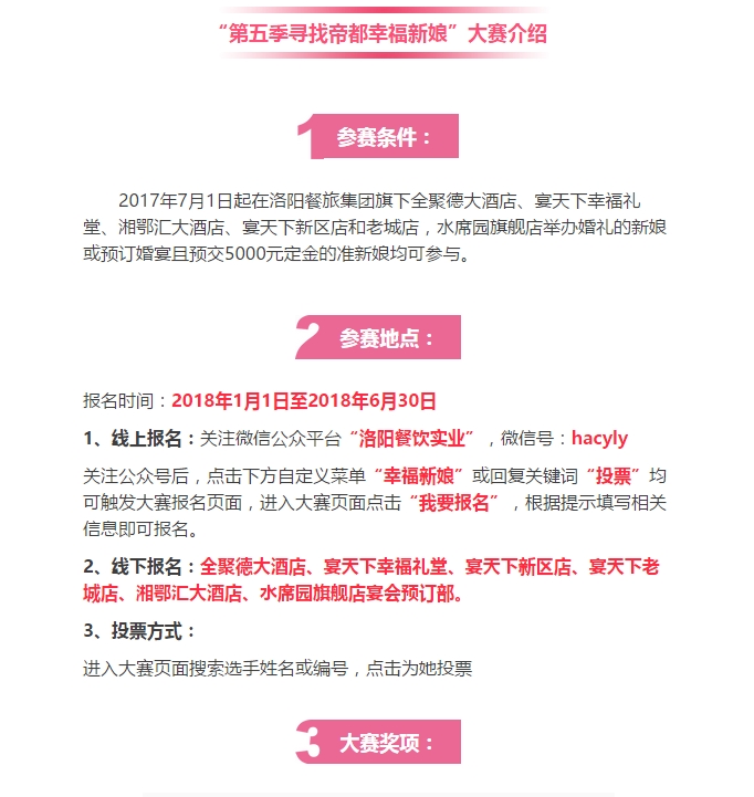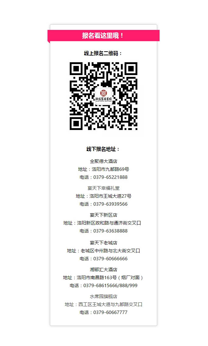 洛阳餐旅办婚宴,幸福新娘奖十万!第五季“寻找帝都幸福新娘”大型评选活动开始啦! 发布时间:2018-01-17来源:点击:2921 洛阳餐旅 宴会专家全国预订客服热线:400-616-3939微信号:hacyly股票代码:836977长按二维码识别后添加关注以上信息来源于洛阳餐旅集团官网:www.allenresha.com 分享到:0 用手机看 拍下二维码,信息随身看 试试用微信扫一扫,在你手机上继续观看此页面。 上一篇:洛阳餐旅集团旗下各店2018年2月-5月可预订宴会日期一览表(1.15更新) 下一篇:洛阳餐旅董事长申灵杰获餐饮世界年度贡献奖