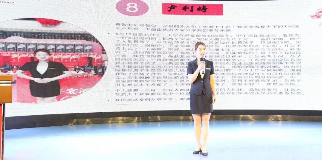 本次活动还邀请了宴天下老城店薛彩霞、全聚德大酒店白蕊霞、水席园旗舰店郭春丽、宴天下新区店孙亚佩等店总和总监为大家分享宴会私人定制以及如何提升宴席预定的心得体会。薛彩霞在总结自己宴会心得时说:“***点,用心工作,用实际行动来说话。第二点,做好口碑——让顾客来做宣传员。要善于了解分析市场,了解同行业的经营与自己的长板与短板,知己知彼百战不殆。分析顾客群体层次,锁定目标跟踪拜访,比如说有消费潜力的单位,跟踪好关键的几个人,服务好,常联系,给足他们面子。视顾客为家人,真诚用心做好服务,用实际行动感动客人从而留下客人。”白蕊霞在分享中表示:“没有***的个人,只有***的团队。所谓私人定***务,就是把客人当家人,用我们的亲情拉近与客人的距离,竭尽全力满足他们的所思所想,无微不至地提供全方位的服务,真正让客人感受家的温暖与爱的味道。”郭春丽在总结自己的心得时表示:“作为一名餐饮人,所有的宴会服务要做在客人开口之前,用心服务,挖掘一切能够为客人提供惊喜的瞬间,感动顾客,让顾客主动为我们宣传。”孙亚佩在总结自己的心得时表示:“5月份我们为客人做了十余场的私人订制,在带给客人感动的同时,我们用心地记录了每次的宴会精彩瞬间并进行宣传,达到了一定的转换效果。客人愿意把宴会放在我们宴天下新区店,我们所有的员工都会尽***大努力让客人满意,我们相信有舍必有得,付出总会有回报,相信我们真诚的服务,一定会迎来客人更多的赞誉。”